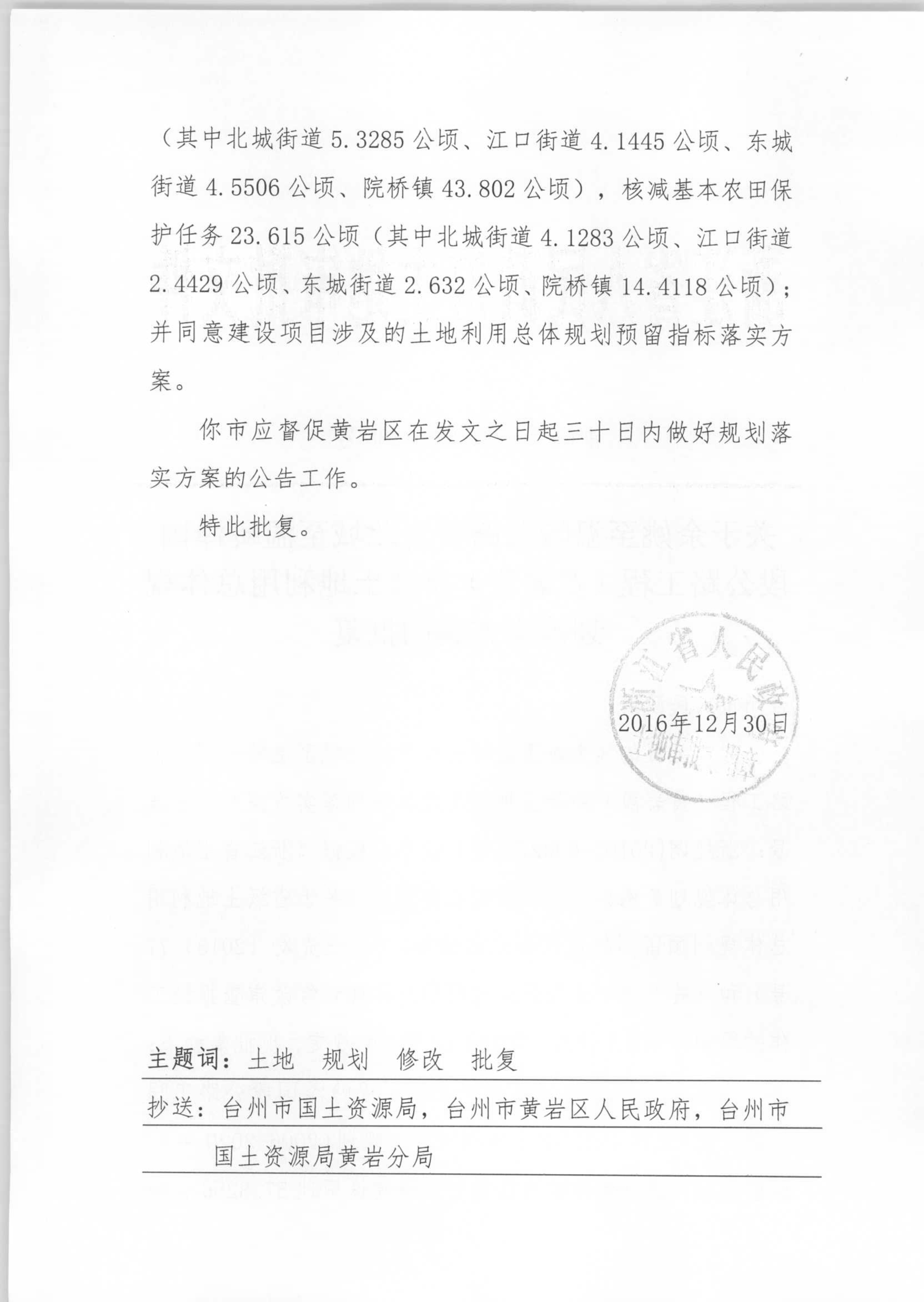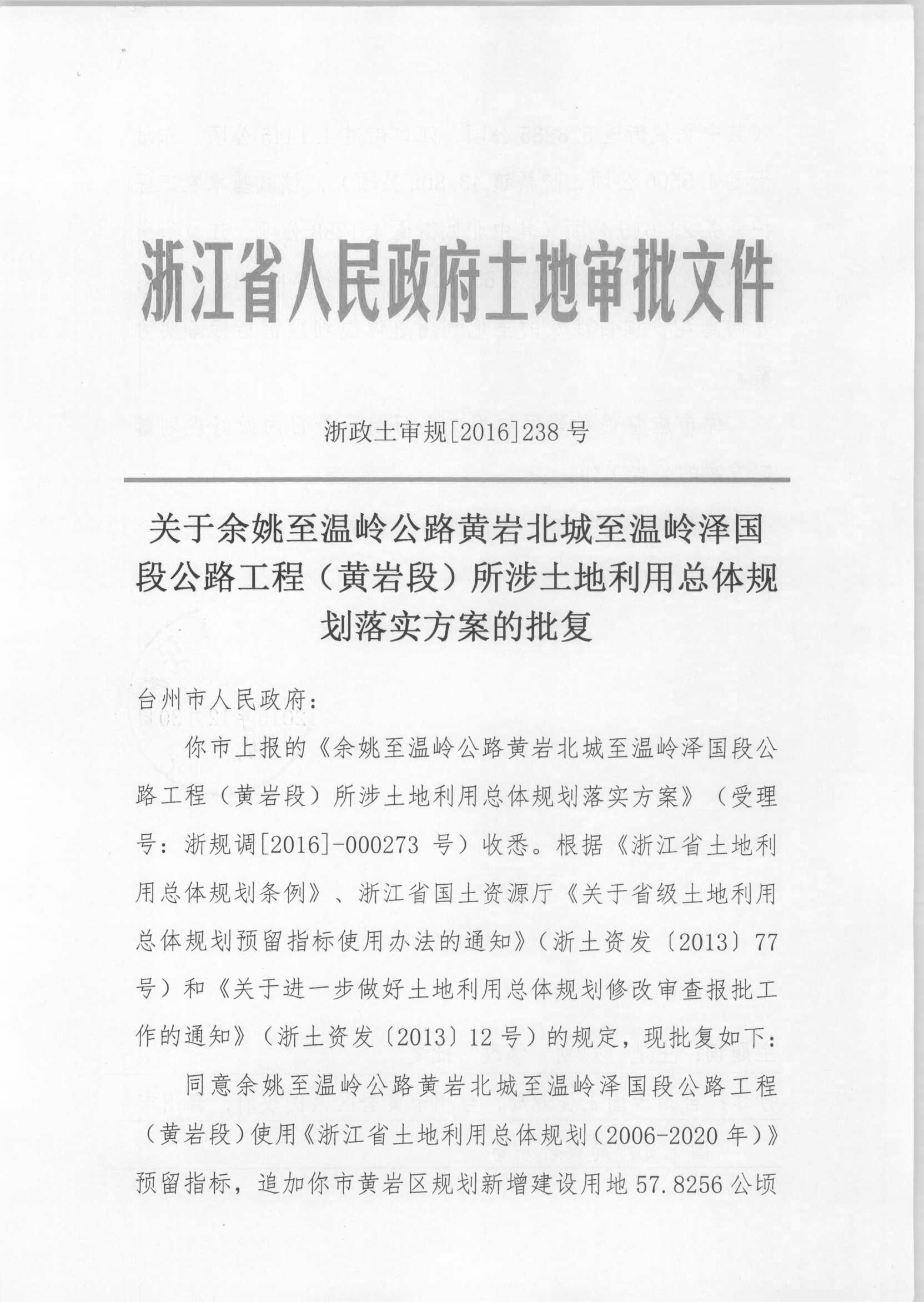 关于余姚至温岭公路黄岩北城至温岭泽国段公路工程(黄岩段)所涉土地利用总体规划落实方案的批复