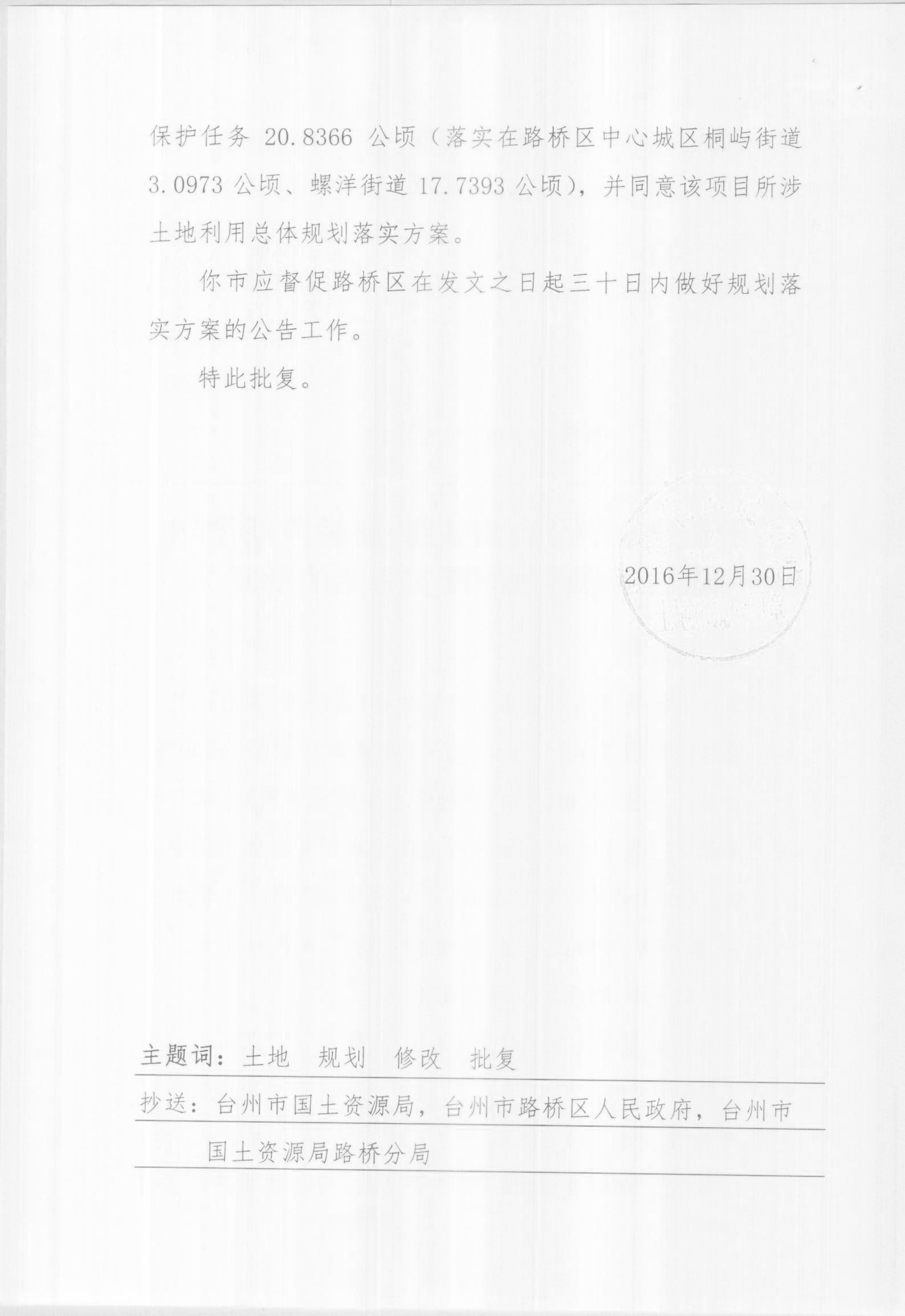 关于台州市域铁路S1线一期工程(路桥段)及安置用地项目所涉土地利用总体规划落实方案的批复