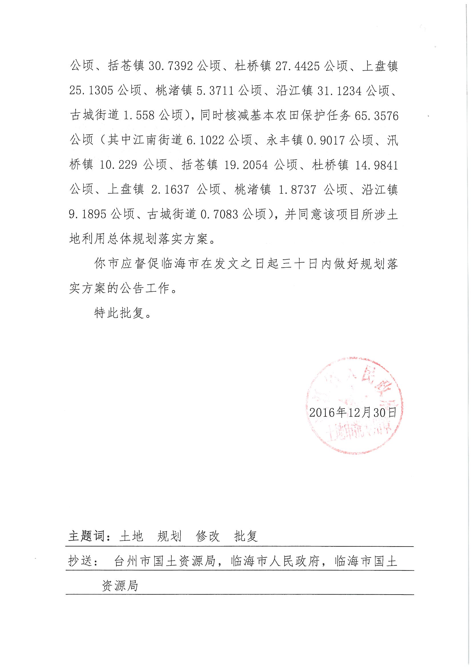关于新建金华至台州铁路(临海段)所涉土地利用规划落实方案的批复