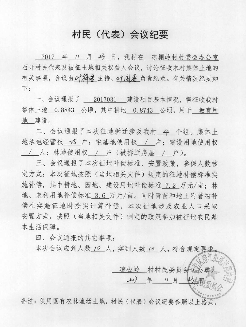 台州市2017年度第4批次(黄岩2)城市建设用地澄江街道凉棚岭村会议纪要