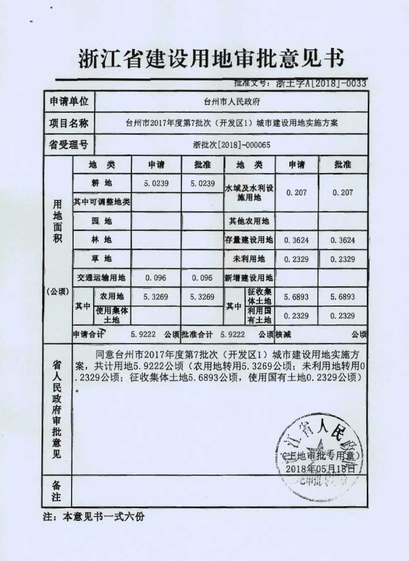 台州市2017年度第7批次(开发区1)城市建设用地实施方案审批意见书