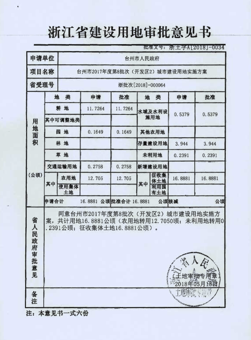 台州市2017年度第8批次(开发区2)城市建设用地实施方案审批意见书