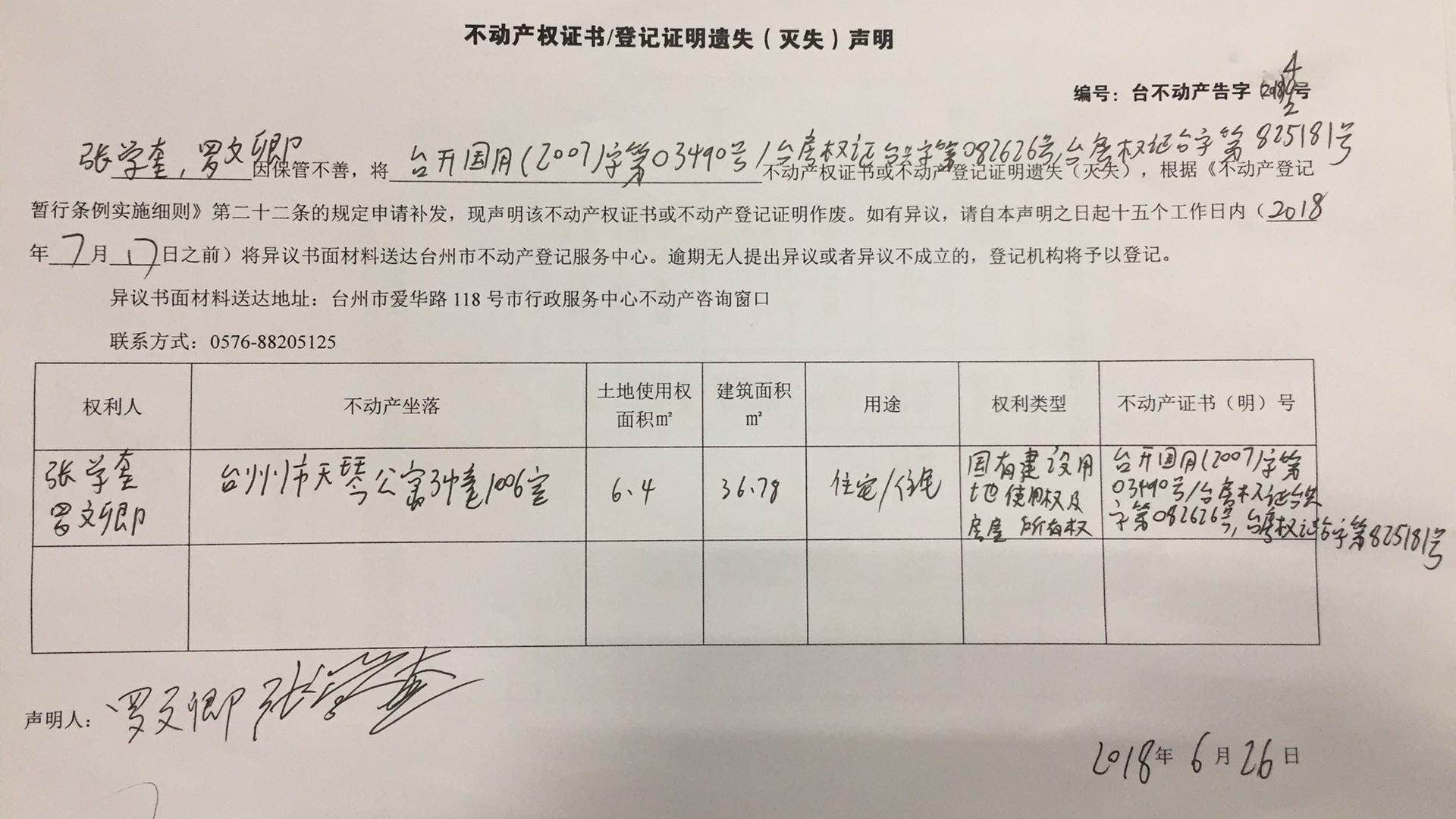 不动产权证书/登记证明遗失(灭失)声明 台不动产告字(2018)492号