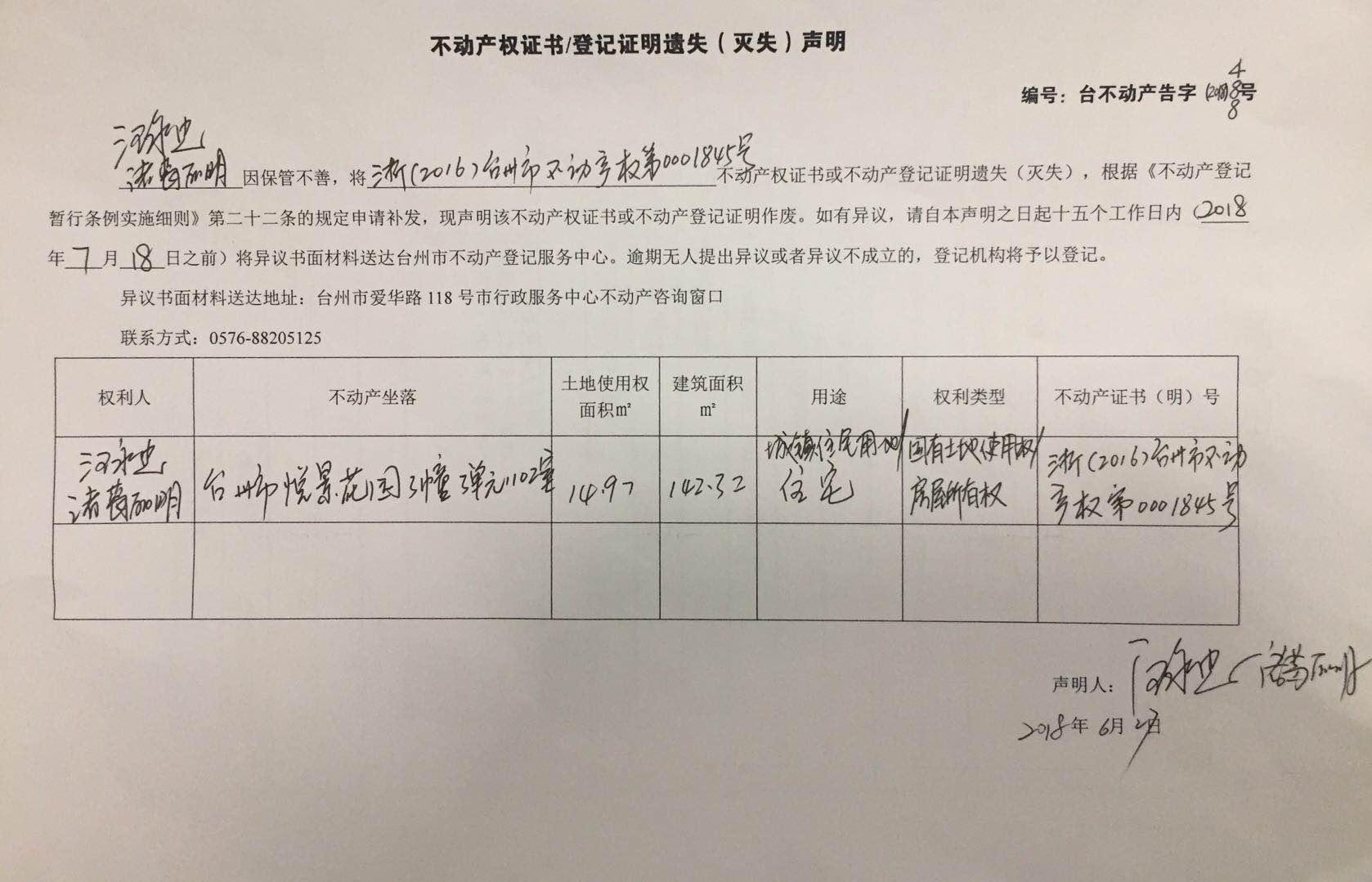 不动产权证书/登记证明遗失(灭失)声明 台不动产告字(2018)488号