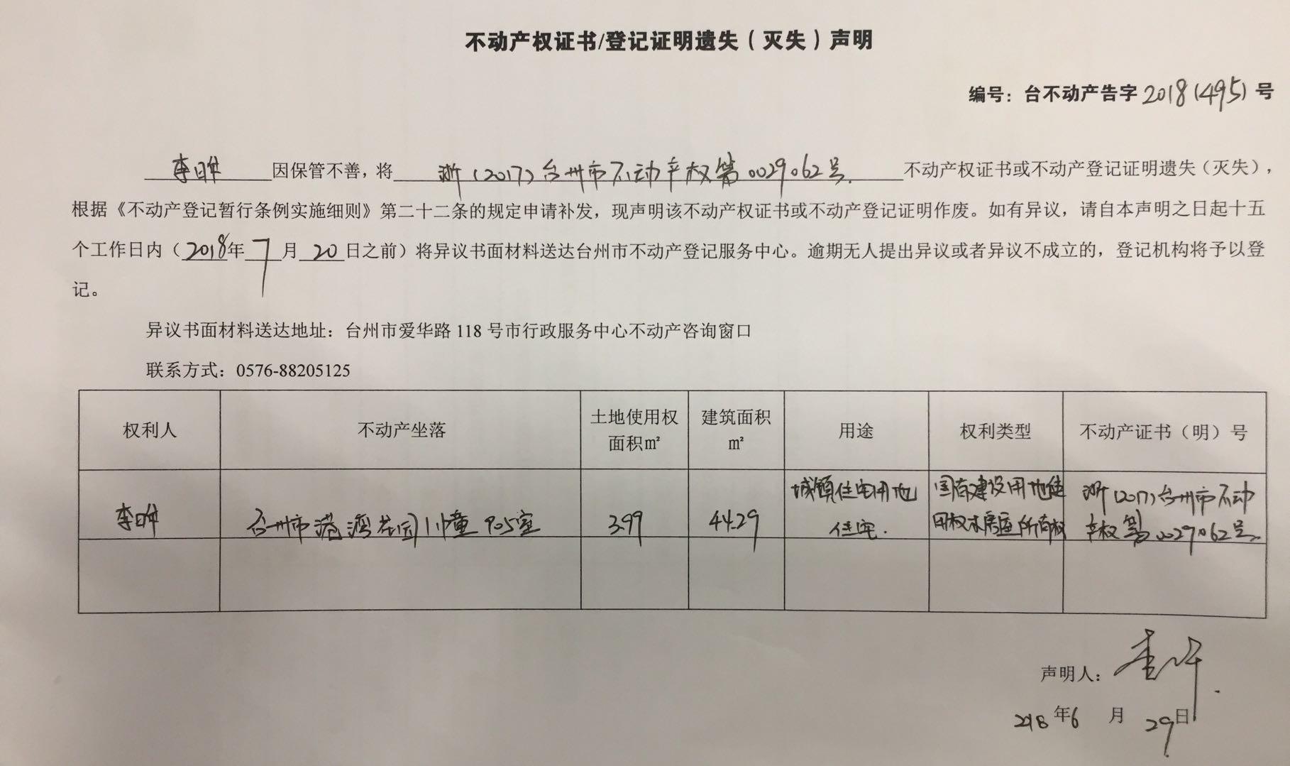 不动产权证书/登记证明遗失(灭失)声明 台不动产告字(2018)495号