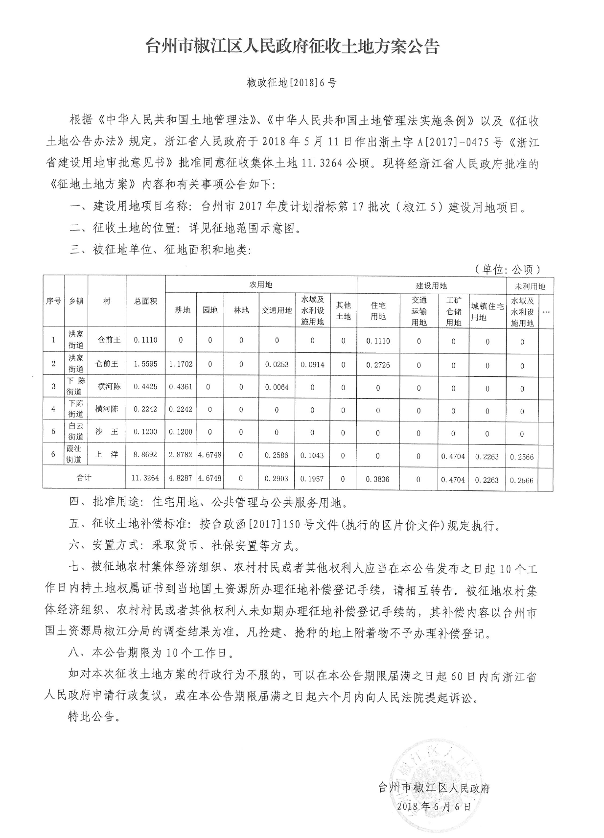 台州市2017年度计划指标第17批次(椒江5)建设用地项目征收土地公告