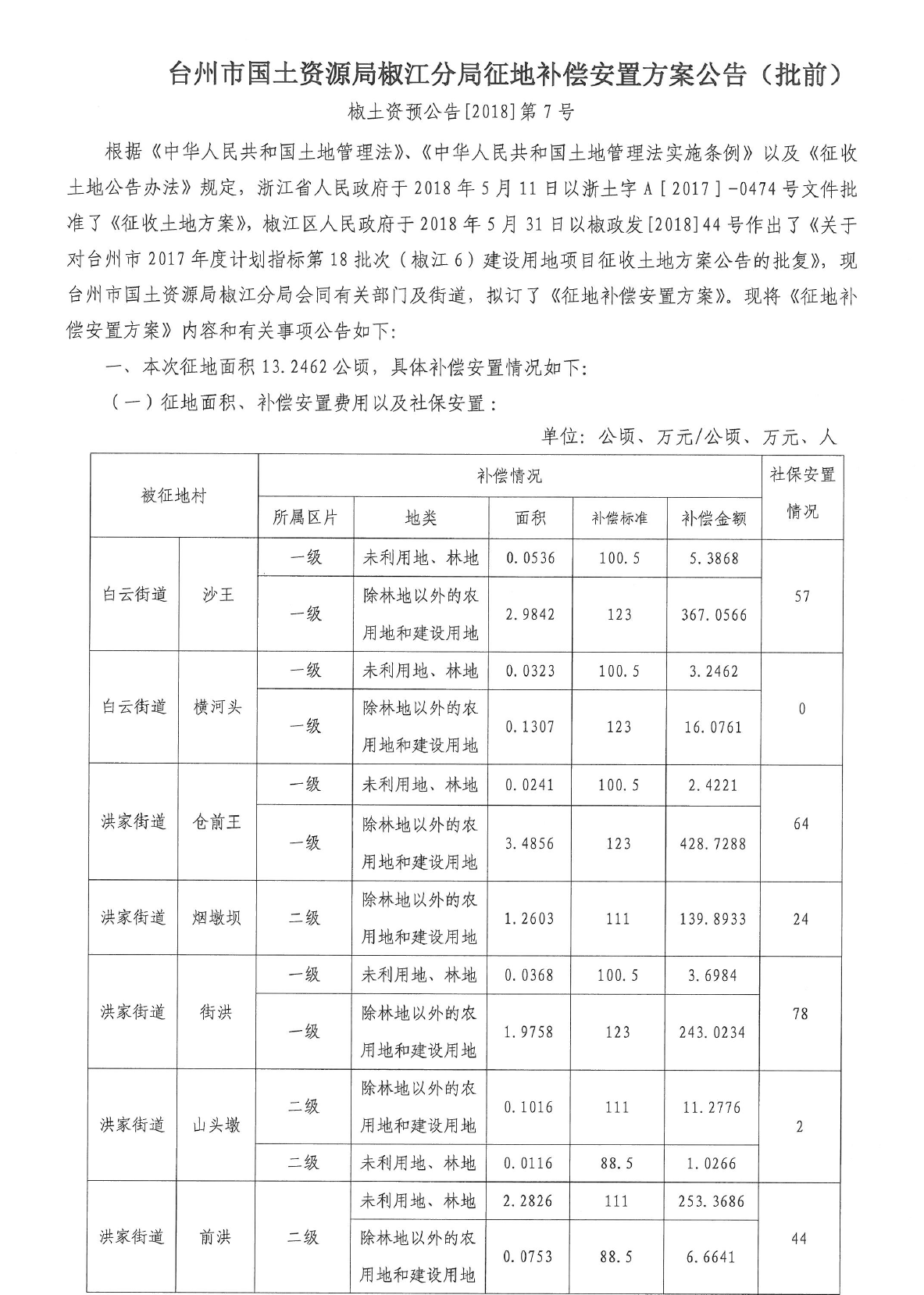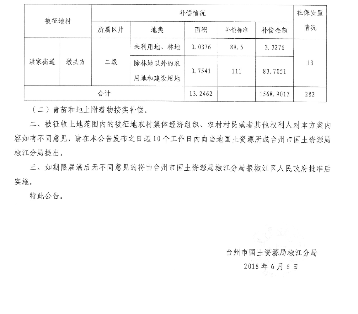 台州市2017年度计划指标第18批次(椒江6)建设用地项目补偿安置公告