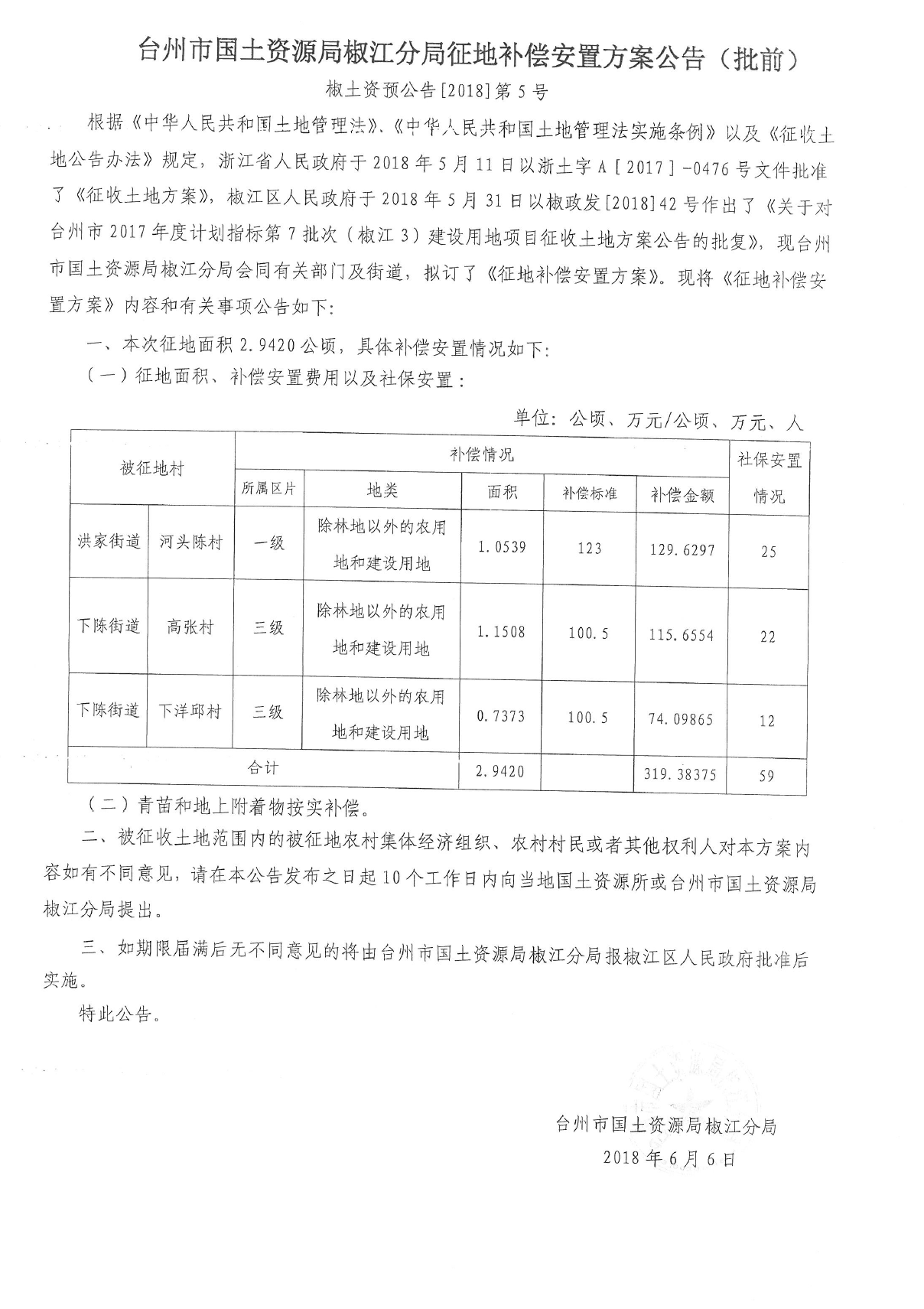 台州市2017年度计划指标第7批次(椒江3)建设用地项目征地补偿安置公告