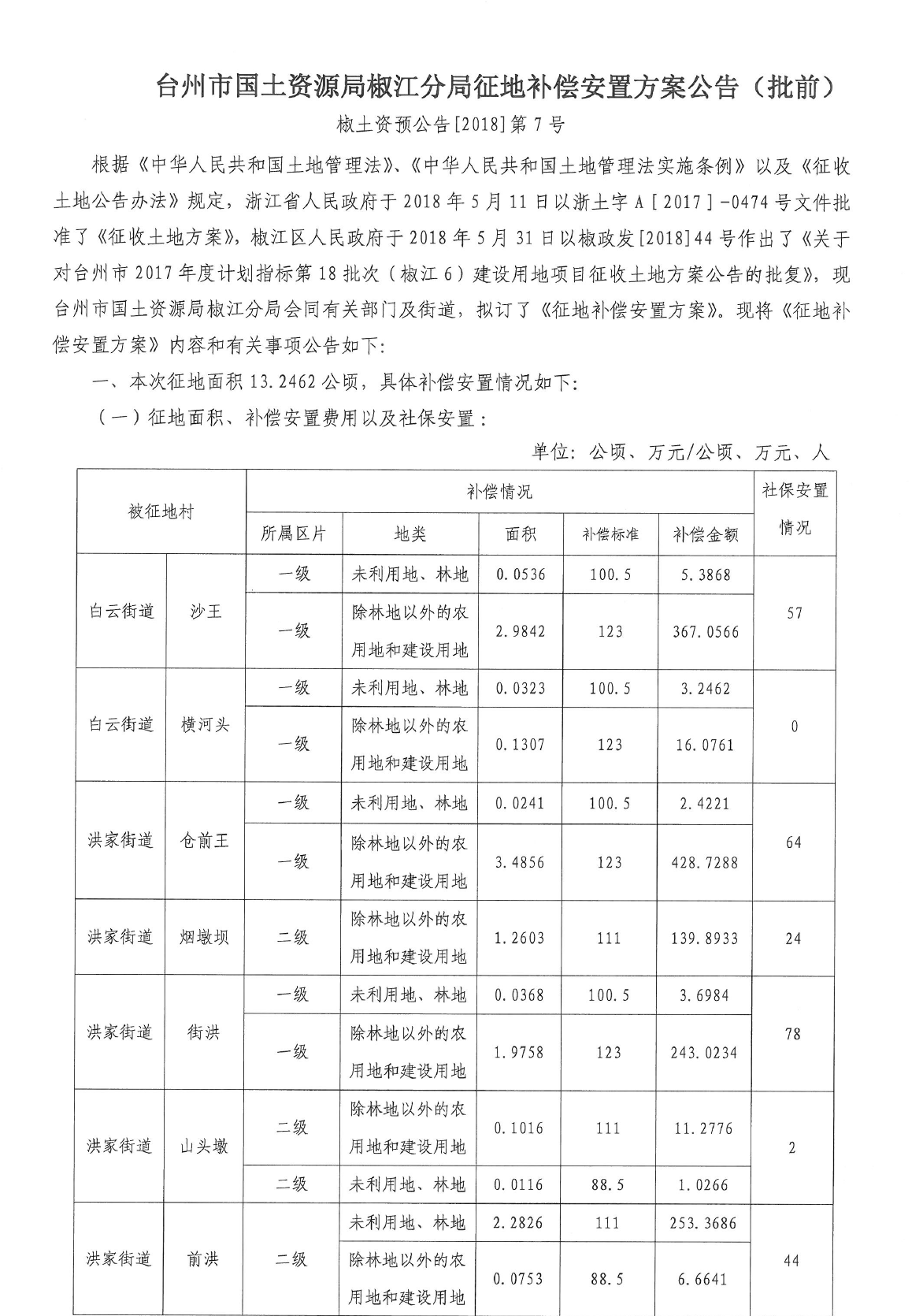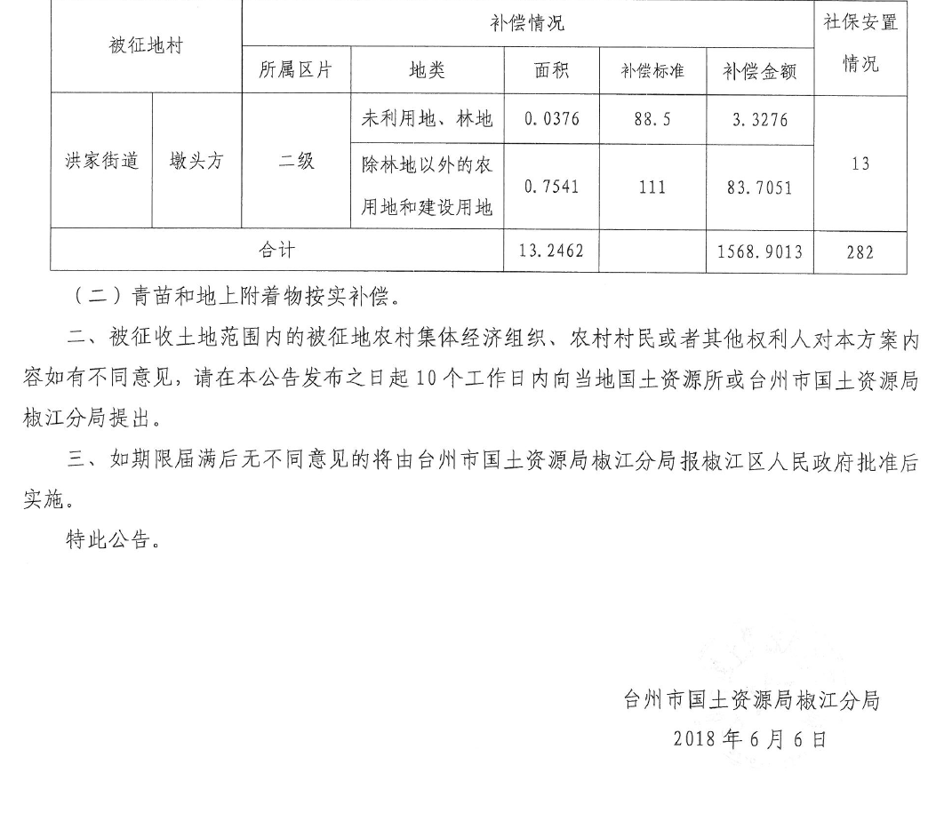 台州市2017年度计划指标第18批次(椒江6)建设用地项目征地补偿安置公告