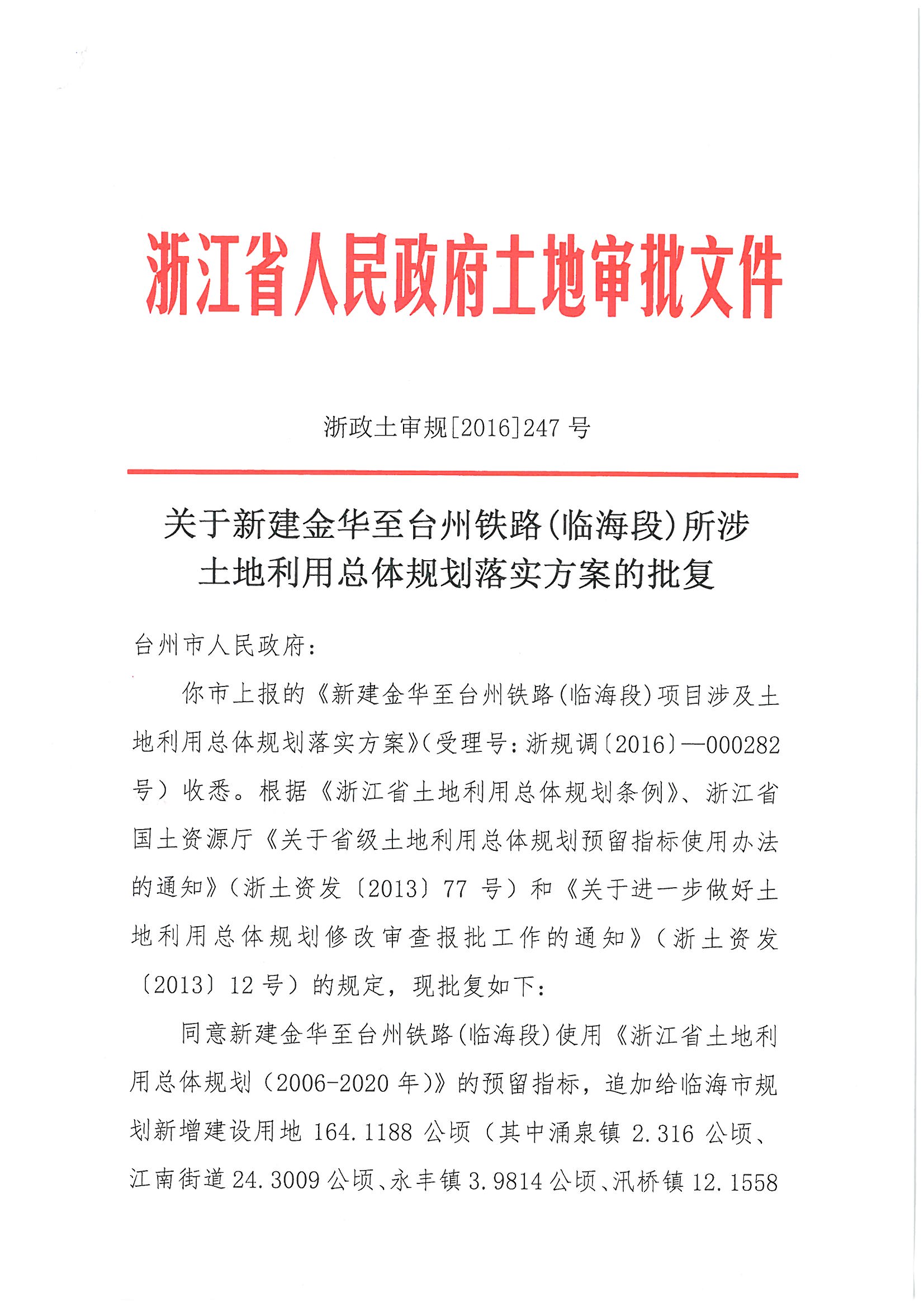 关于新建金华至台州铁路(临海段)所涉土地...